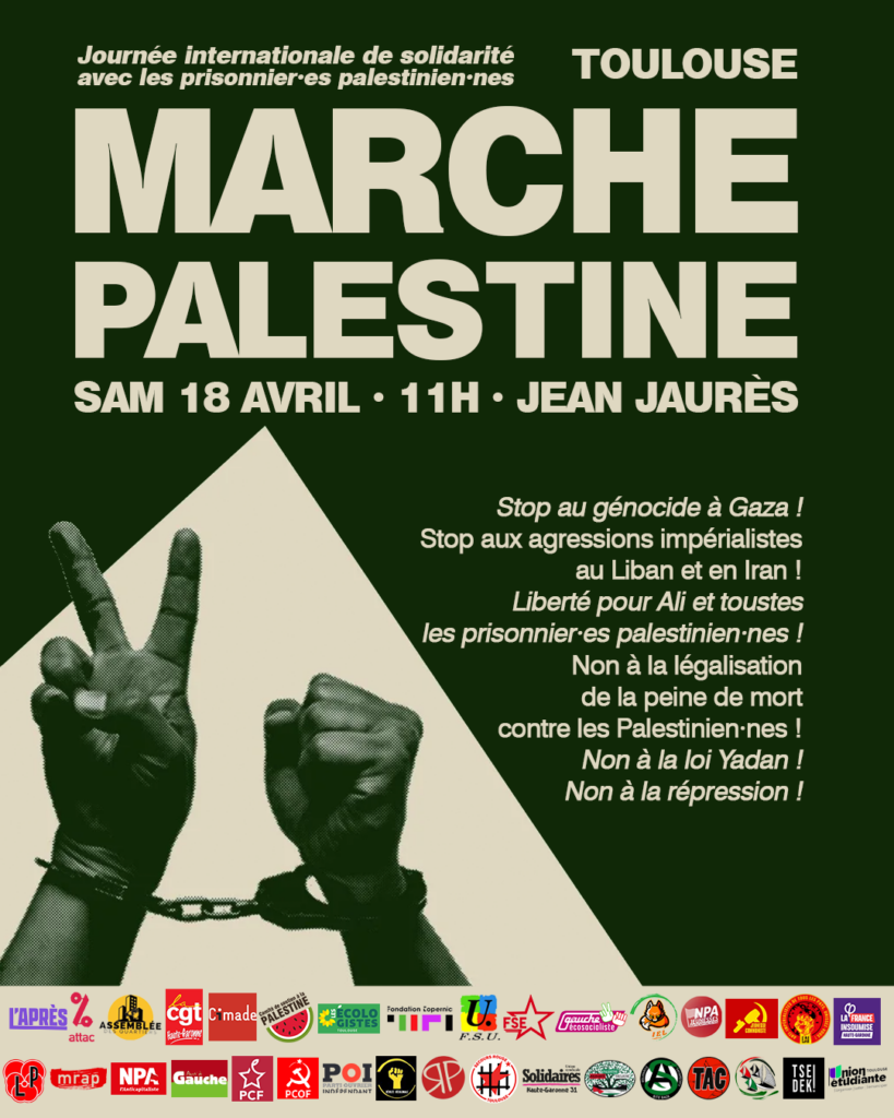 A l’occasion de la journée internationale de solidarité avec les prisonnier·es palestinien·nes et au vu des agressions imp »e »rialo-sionistes, soyons nombreux·ses dans la rue pour la fin de la colonisation en Palestine, la liberté de toustes les prisonnier·es palestinien·nes dans les prisons sionistes et occidentales et contre la loi Yadan, symbole de la complicité française avec l’occupation sioniste !