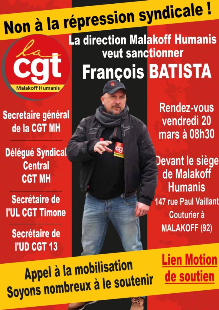 Le syndicaliste François Batista, délégué central de la Confédération générale du travail au sein du groupe Malakoff Humanis et secrétaire de l’UD CGT 13, est convoqué à un entretien disciplinaire pour des propos jugés injurieux, une décision qu’il conteste en l’attribuant à ses activités syndicales et à la dénonciation de conditions de travail dégradées. Dans un contexte de tensions sociales et d’autres cas récents de répression syndicale, la CGT appelle à un rassemblement de soutien le 20 mars devant le siège de l’entreprise.