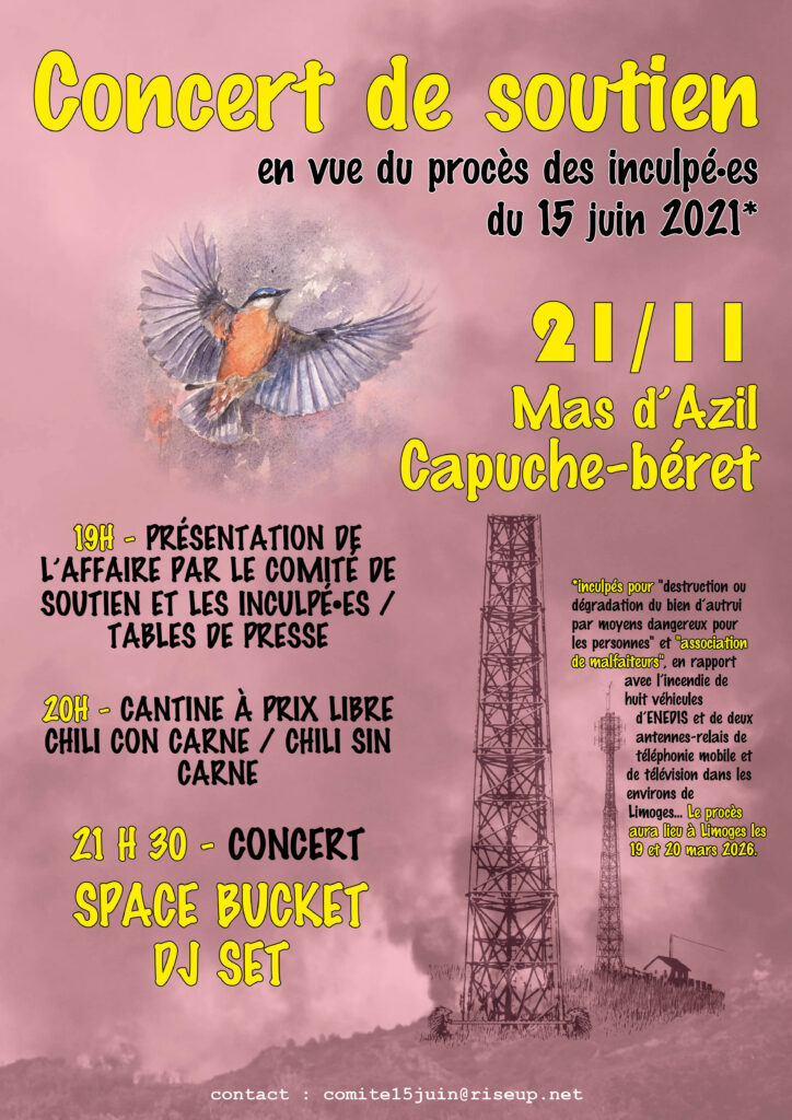 Cinq ans après la vague d’arrestations du 15 juin 2021 (voir notre article), un procès se tiendra à Limoges les 19 et 20 mars 2026. Plusieurs personnes y seront jugées pour « destruction ou dégradation du bien d’autrui par moyens dangereux pour les personnes » et « association de malfaiteurs », en lien avec l’incendie de huit véhicules d’Enedis ainsi que de deux antennes-relais de téléphonie mobile et de télévision. En amont de cette audience, Capuche-Béret organise une première soirée de soutien le 21 novembre au Mas d’Azil (Ariège), afin de mobiliser autour du procès à venir.