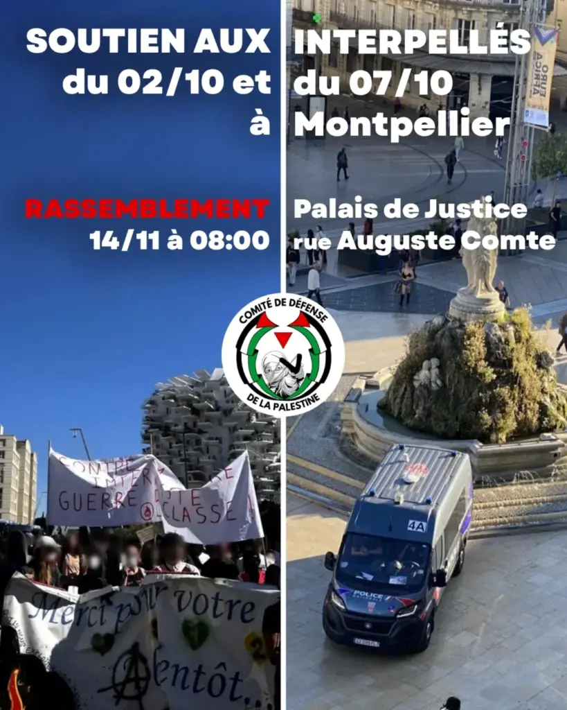 Suite à une vague d’arrestations le 7 octobre dernier à Montpellier (voir notre article), un militant pro-palestinien passe en procès le 14 novembre prochain. Afin de le soutenir, le Comité de Défensé de la Palestine appelle à se rassembler dès 8H devant le Palais de Justice (rue Auguste Comte, Montpellier).