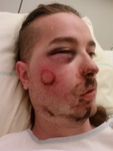 Une personne qui avait pris plusieurs photos se fait arracher son appareil photo, puis les policiers shootent dedans afin de le réduire en morceaux. Trois personnes prennent des coups, se font tabasser au sol puis embarqués, crane ouvert, arcades défoncées. Une autre qui s’en allait à l’opposé des policier se fait tirer dessus au flash-ball. Tir tendu, depuis l’autre coté de la route, à pas plus de 5 mètres. A l’hôpital, on constate qu’une bonne partie des os autour de sa pommette droite, sous son œil, sont en bouillie. Quatre personnes embarquées sont placées en garde à vue pour violation de domicile. Trois d’entre elles sont sorties: une sans suites, une avec un rappel à la loi, et une avec une convocation pour un procès devant la chambre correctionnelle de Toulouse.