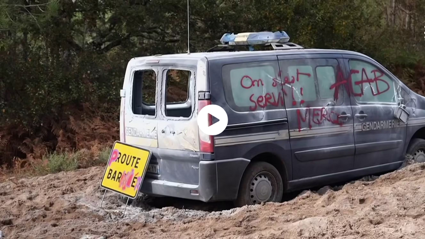 Hier samedi, à Lerm-et-Musset (Gironde), sur le tracé de la LGV Bordeaux-Toulouse, plus de 1 000 personnes se sont rassemblées pour dénoncer le projet d’autoroute ferroviaire qui couperait le territoire en deux. Sur ordre de la préfecture, la gendarmerie s’était déployée pour éviter que le campement ne se transforme en ZAD. Un fourgon de la gendarmerie a été attaqué par une cinquantaine de manifestants cagoulés. Le véhicule à essayer de partir mais il s’est enlisé et les quatre gendarmes l’ont abandonné et se sont encourus, laissant les manifestant le piller, le dévaster et le taguer (« ACAB », « on s’est servit merci » et « ça c’est pour l’hélico » : l’hélicoptère des gendarmes avaient effectué des vols à basse altitude sur le camp au milieu de la nuit – il avait d’ailleurs essuyé des tirs d’engins pyrotechniques). Voir une vidéo