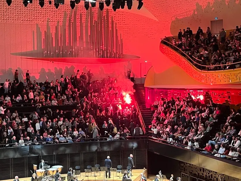 Quatre personnes ont été placées en garde à vue à la suite d’une action jeudi soir à la Philharmonie de Paris lors d’un concert de l’Orchestre philharmonique d’Israël afin de dénoncer l’utilisation de l’art comme outil de softpower au service du génocide en Palestine comme l’a expliqué Palestine Action France dans un communiqué (voir ici). À trois reprises, des spectateurs en possession d’un billet ont tenté de diverses manières d’interrompre le concert, notamment avec des fumigènes, et ils ont été violemment attaqués par des sionistes présents dans la salle. Les quatre personnes arrêtées sont trois femmes et un homme, dont trois pour participation à un groupement en vue de commettre des violences ou dégradations et une pour organisation d’une manifestation non déclarée. Par ailleurs, la Philharmonie a annoncé son intention de porter plainte. Afin d’exiger leur libération, un rassemblement de soutien était organisé dès 8H ce 7 novembre devant le commissariat du XIXᵉ arrondissement de Paris.