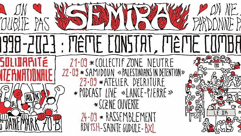 Le 22 septembre 1998, Semira Adamu, jeune femme nigériane de 20 ans, subit sa sixième tentative d’expulsion, à laquelle elle tente de résister encore, en chantant. Les 9 gendarmes qui l’« escortent » veulent alors la faire taire et décident d’appliquer la « technique du coussin ». Pendant 11 minutes, ils maintiennent sa tête enfoncée dans un coussin. Ils la tuent. Plusieurs initiatives ont lieu pour commémorer cet assassinat. Attention au changement de programme: La manifestation de dimanche 24 septembre prévue à Steenokkerzeel est reportée. Rendez-vous Esplanade sainte-Gudule à Bruxelles dimanche 24 septembre à 15h.