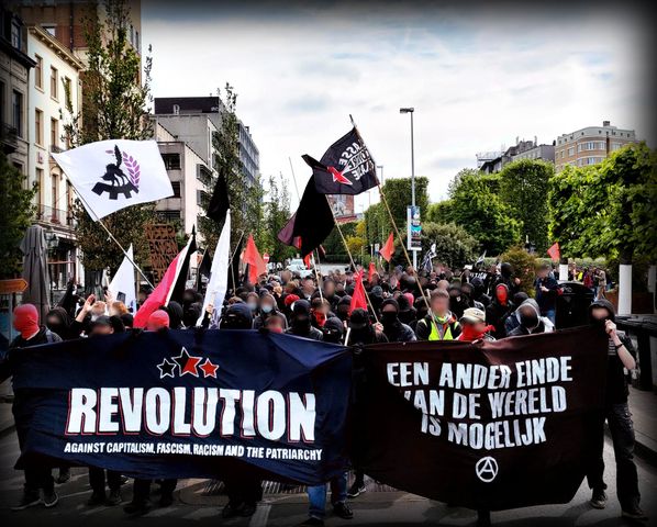 Entre 600-700 personnes ont manifesté de la Place Morichar à la Gare Centrale pour le 1er Mai Révolutionnaire. De nombreux groupes de la gauche révolutionnaire, anarchistes, autonomes, communistes, anti-fascistes, syndicalistes révolutionnaires, féministes révolutionnaires, des groupes révolutionnaires de l’immigration politique en Belgique ont répondu à l’appel, venus d’Antwerpen, de Leuven, de Louvain-la-Neuve, de Namur, de Liège, d’Amsterdam. Trois interventions ont été lues au micro : celle l’Alliance VNR féministe révolutionnaire, celle du Leuven Anarchistische Groep et celle du mouvement de libération kurde. Le cortège a traversé Saint-Gilles de la Barrière à la Porte de Hal pour entrer à Bruxelles-Ville par la Rue Haute où plusieurs actions directes ont visé des symboles de la gentrification, du colonialisme (comme l’Agence Belge de Développement) et du capitalisme, comme plus loin au PS. Le cortège s’est dissout devant la Gare Centrale.