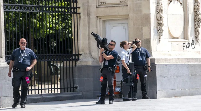 Le policier de gauche pointe vers le ciel un SkyWall 100. Son système de visée utilise des algorithmes prédictifs pour s’assurer que la cible soit atteinte. Une fois la cible atteinte, le projectile déploie un filet spécialement conçu pour emmêler le drone, puis utilise un parachute pour ramener le tout au sol en toute sécurité. Son temps de rechargement rapides permettent à une personne d’attaquer plusieurs drones. La policière de droite tient (pointé vers le bas) un Droneshield DroneGun Tactical, un appareil britannique qui brouille les fréquences de telle sorte que l’opérateur perde le contrôle de son drone. La portée de cet appareil est de 2,5km.