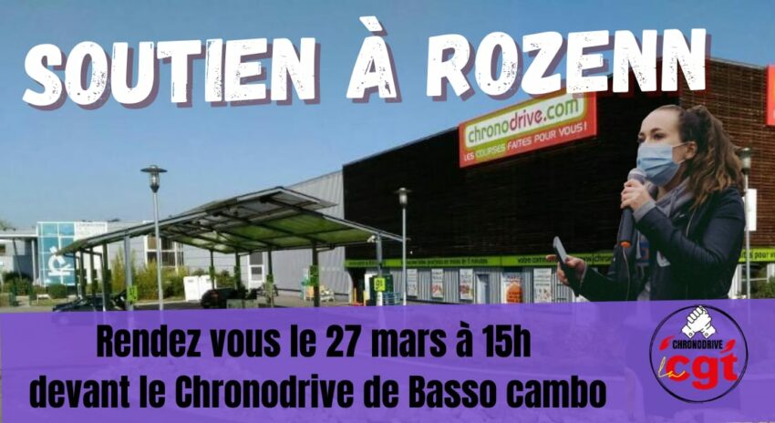 Rozenn, syndicaliste à la CGT Chronodrive, a été mise à pied en vue d’un potentiel licenciement. Le motif invoqué par la direction de cette entreprise de la grande distribution est un tweet de Rozenn qui dénonce le gaspillage alimentaire de Chronodrive. En réalité, cette répression a lieu car Rozenn a dirigé une lutte contre les violences sexistes à Chronodrive avec plusieurs de ses collègues. Face à cette situation, une large campagne de solidarité s’organise avec un twitterstorm mercredi 24 mars à 20H autour du hashtag #SoutienRozenn et un rassemblement samedi 27 mars à 15H devant le Chronodrive de Basso Cambo (16 Avenue du Dr Maurice Grynfogel, 31100 Toulouse).