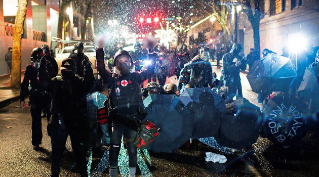 A Portland, un grand nombre de personnes étaient rassemblées vendredi dans la zone de Southwest 3rd Avenue, autour de Southwest Main Street, La police leur a intimé l’ordre de partir immédiatement: «Si vous ne partez pas, vous risquez d’être arrêté, cité et/ou sujet au recours à la force», ont menacé les policiers de Portland avec des mégaphones. Les affrontements ont aussitôt commencé. Des groupes de manifestants ont attaqué les forces de police, un centre commercial, le palais de justice fédéral au moyen de feux d’artifices et de cocktails Molotov. D’autres ont tenté pour pénétrer par effraction dans le centre de justice situé au 1120 Southwest 3rd Avenue. Outre les cocktails Molotov et les engins pyrotechniques, les  policiers ont canardés de pierres, des briques, de bouteilles d’eau congelée et de ballons de peinture. Les policiers ont chargé et utilisé des engins fumigènes, lacrymogènes, et des munitions non-létales. Des arrestations ont eu lieu mais les détails ne sont pas encore disponibles. Les forces de répression ne comprenait pas uniquement les policiers locaux, mais des agents des services fédéraux (en fait une division en uniforme du Département de la sécurité intérieure).