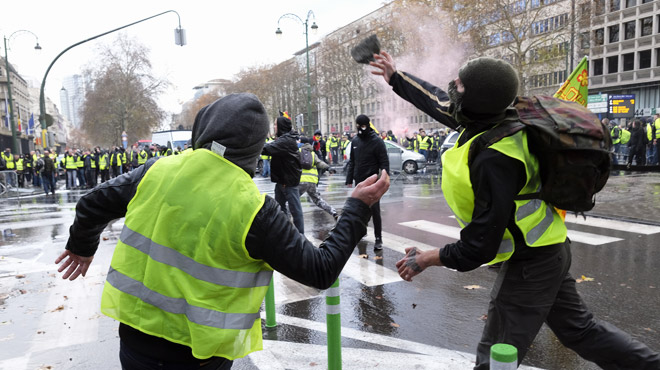 12h15: Gilets jaunes au carrefour Trêve/Belliard. Des policiers étrangers (probablement hollandais) sont présents. Petits affrontement.