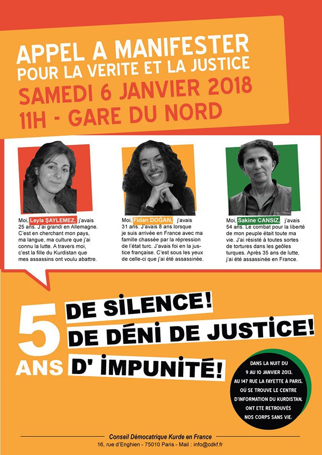 Mercredi 9 janvier 2013, les militantes kurdes Sakine Cansız, Fidan Doğan (Rojbîn) et Leyla Saylemez étaient froidement exécutées d’une balle dans la tête, dans les locaux du Centre d’Information du Kurdistan, situés au 147 rue La Fayette, à Paris. L’enquête menée en France a révélé que le meurtrier présumé, Ömer Güney, arrêté quelques jours après le crime, avait agi pour le compte des services secrets turcs. Le réquisitoire du Procureur de la République va dans ce sens.