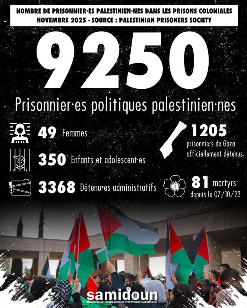 Le nombre de détenus dans les prisons israéliennes est de 9 250 selon un décompte de plusieurs organisations palestiniennes en novembre 2025. La majorité d’entre eux sont des personnes placées en détention administrative ou toujours en état d’arrestation. Il est important de noter que ce chiffre n’inclut pas les personnes détenues dans les camps militaires relevant de l’armée israélienne. Le nombre de femmes détenues s’élève à 49, dont une originaire de Gaza. Le nombre de mineurs détenus a atteint 350, incarcérés dans les prisons d’Ofer et de Megiddo.
