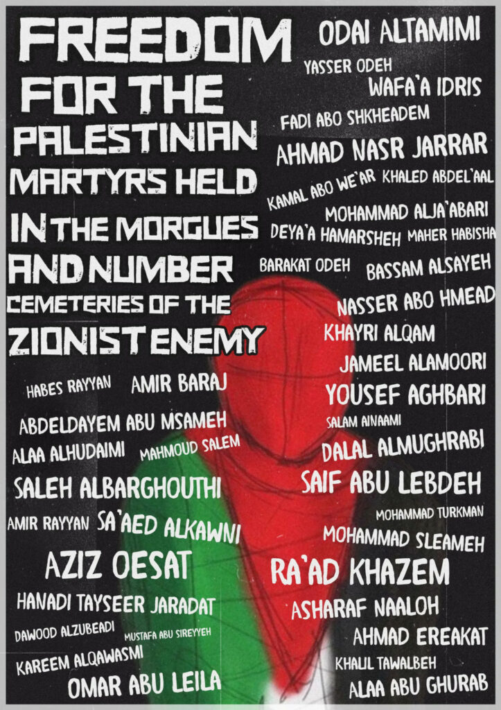 Une forme particulièrement perverse de répression du peuple palestinien est « l’emprisonnement des corps », la rétention, par les autorité israéliennes, des dépouilles des résistants. Aujourd’hui, 256 résistants palestiniens sont enterrés dans des tombes ne portant qu’un numéro (renvoyant à une identité connue des seules autorités israéliennes), tandis que 142 autres sont gardés dans les morgues de l’occupation depuis 2015. Parmi eux figurent 11 prisonniers, 14 enfants et 5 femmes. Il s’agit pour les autorités d’occupation d’exercer un chantage sur les familles en leur refusant la possibilité d’enterrer leurs proches.