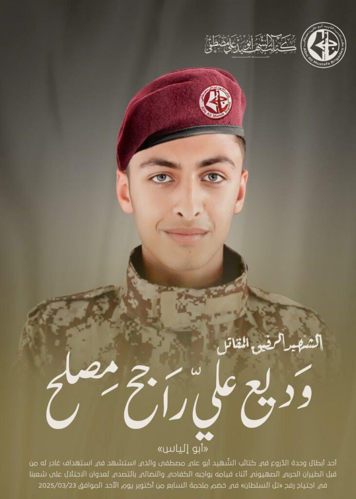 La branche militaire du Front Populaire de Libération de la Palestine, les Brigades Abu Ali Mustapha, viennent d’annoncer la mort de leur combattant Wadih Ali Rajeh Musleh, aussi appelé Abu Elias. Âgé de 18 ans, il était membre de l’unité blindée de la faction armée et a été assassiné lors d’un raid aérien de l’armée israélienne le 23 mars dernier à Rafah alors qu’il participait à la résistance contre l’opération génocidaire.