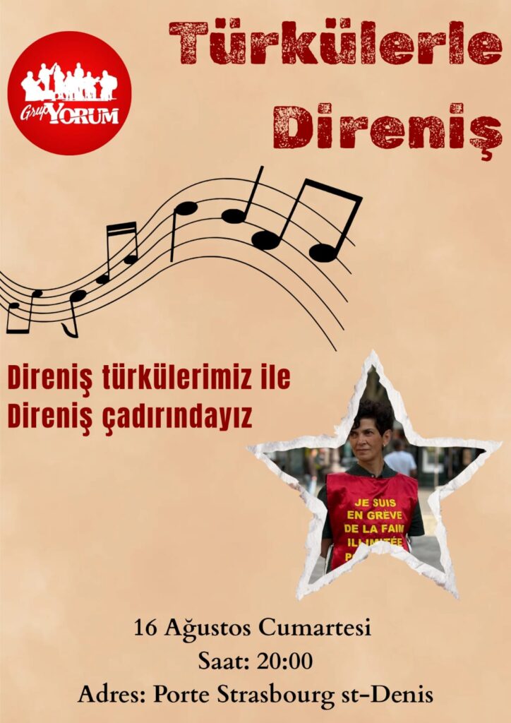La révolutionnaire turque Zehra Kurtay est en grève de la faim depuis 44 jours contre le risque d’une expulsion après avoir reçu une Obligation de Quitter le Territoire Français (voir notre article). Alors que la mobilisation continue, Grup Yorum organise un concert de solidarité ce samedi 16 août à 20H à Paris (Porte de Strasbourg Saint Denis).