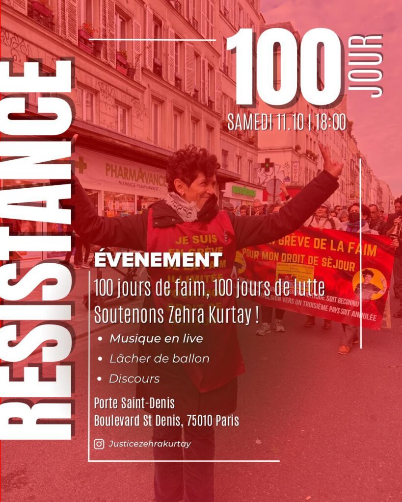 Depuis le 3 juillet dernier, la révolutionnaire turque Zehra Kurtay est en grève de la faim illimitée contre la révocation de son titre de séjour et la menace d’une expulsion. À l’occasion du 100ᵉ jour de sa lutte, un événement est organisé le samedi 11 octobre à 18H porte de Saint Denis dans le Xᵉ arrondissement de Paris.