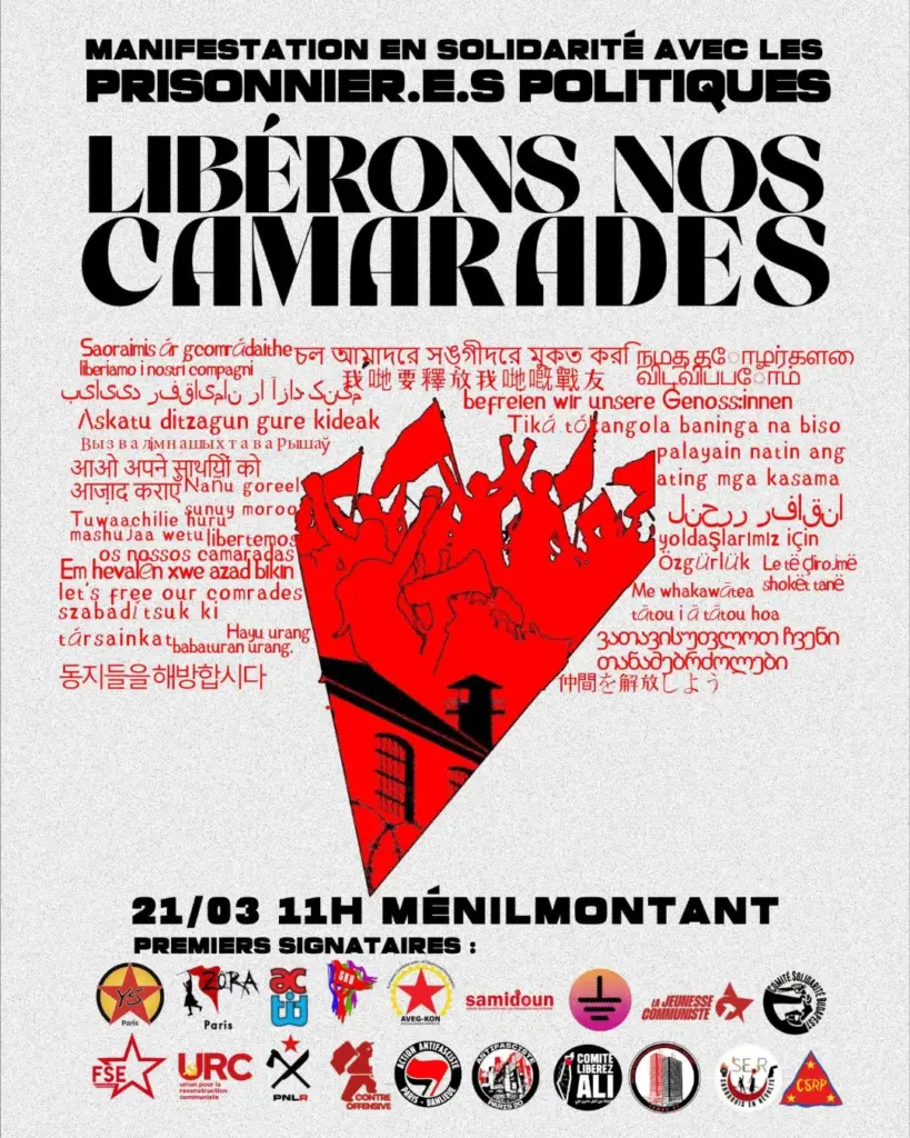 Le 21 mars 2026, dès 11H, dans le quartier de Ménilmontant, une manifestation est organisée dans le cadre de la semaine d’action en solidarité avec les prisonnier·es politiques. L’appel, lancé par plusieurs organisations et collectifs progressistes, souligne que la prison reste un instrument de contrôle de la classe dirigeante, mais que la résistance et l’action révolutionnaire se poursuivent malgré la répression.
