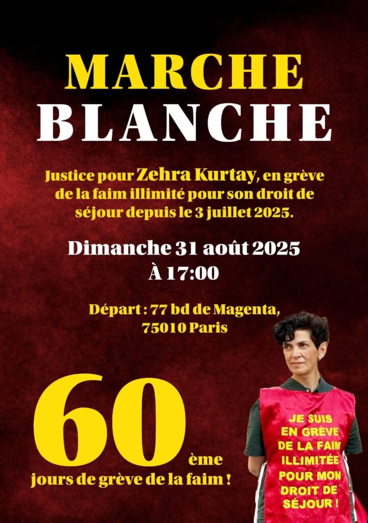 Alors que la révolutionnaire turque Zehra Kurtay est en grève de la faim illimitée depuis le 3 juillet dernier (voir notre article), des actions se multiplient en soutien à la militante et pour défendre son droit au séjour en France. Dimanche 31 août à 17H, une marche blanche est organisée au départ du 77 boulevard de Magenta (75010 Paris).