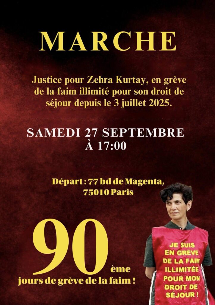 Alors que la révolutionnaire turque Zehra Kurtay est en grève de la faim illimitée depuis le 3 juillet dernier (voir notre article), la campagne se développe pour défendre son droit au séjour en France. En particulier, ses soutiens organisent une marche le dimanche 27 septembre à 17H au départ du 77 boulevard de Magenta (75010 Paris).