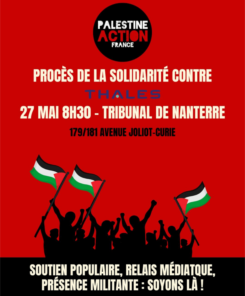 Le 27 mai, 7 militant·es sont poursuivi·es par le géant français de l’aéronautique et de l’armement Thales, ils passeront en procès suite à une action organisée par Palestine Action France pour dénoncer la responsabilité de l’entreprise dans le génocide en Palestine. En effet, la multinationale est le 16ᵉ plus gros vendeur d’armes au monde et collabore avec le principal fabricant d’armes israélien Elbit System. Afin de dénoncer cette situation, de nombreux soutiens de la cause palestinienne appellent à se rassembler ce même jour devant le Tribunal de Nanterre dès 8H30 (179/181 avenue Joliot-Curie).