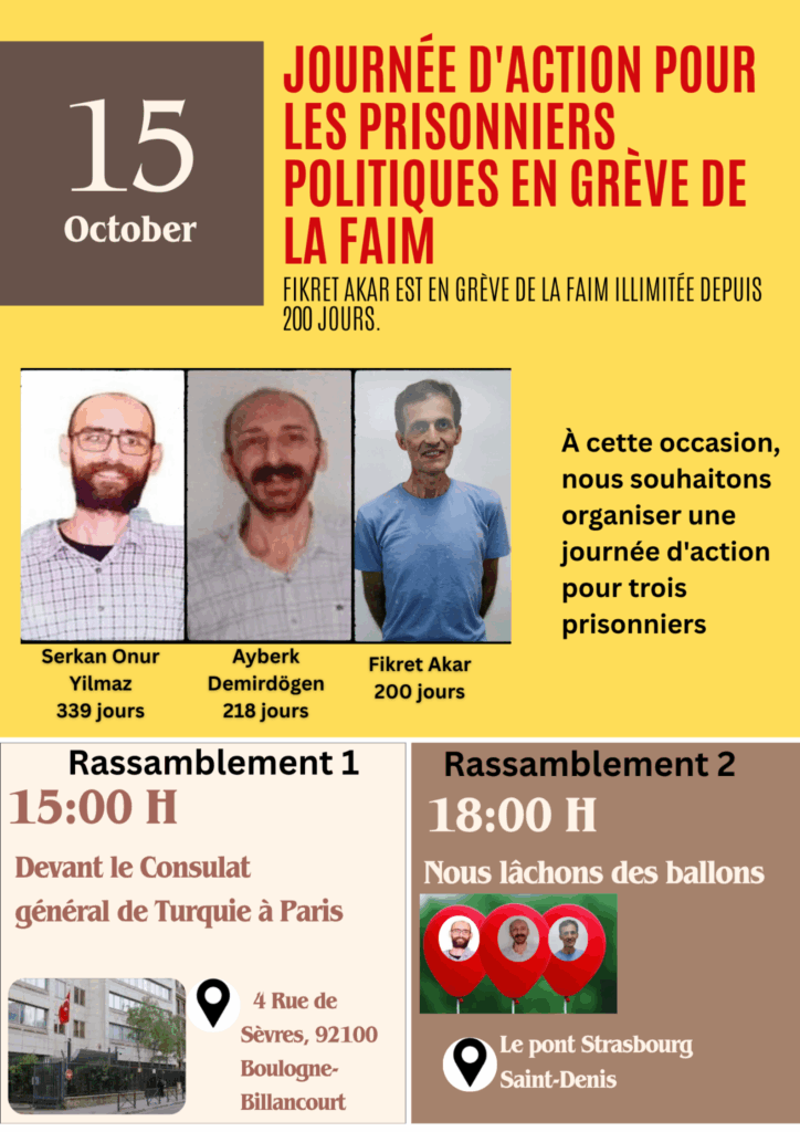 Contre les prisons de type « puits » en Turquie qui sont connues pour leurs conditions de détention particulièrement inhumaines, plusieurs prisonniers révolutionnaires sont en grève de la faim (voir notre article). Parmi eux, Serkan Onur Yilmaz, Ayberk Demirdögen et Fikret Akar sont mobilisés depuis respectivement 339, 218 et 200 jours. Afin de les soutenir, leurs différents soutiens organisent une journée d’action ce 15 octobre. À Paris, un rassemblement est organisé à 15H devant le Consulat général de Turquie (44 Rue de Sèvres, 92100 Boulogne-Billancourt).