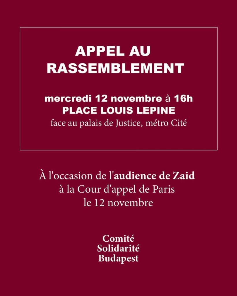 Suite à un mandat d’arrêt émis par la Hongrie qui l’accuse d’avoir participé à des violences contre des militants néo-nazis à Budapest en février 2023, Zaid a passé deux ans dans la clandestinité puis s’est rendu aux autorités allemandes et a été emprisonné de janvier à mai 2025. Après s’être réfugié en France en octobre de la même année (voir notre article), il est sous la menace d’une extradition. Si l’État français décide de le remettre aux autorités hongroises, Zaid encourt jusqu’à 24 ans de prison. Le mercredi 12 novembre à 14h30, le militant antifasciste comparaîtra devant la Cour d’Appel de Paris qui décidera ou non de son extradition. Au même moment, ses soutiens appellent à se rassembler place Louis Lépine (métro Cité, Paris) afin de le soutenir.