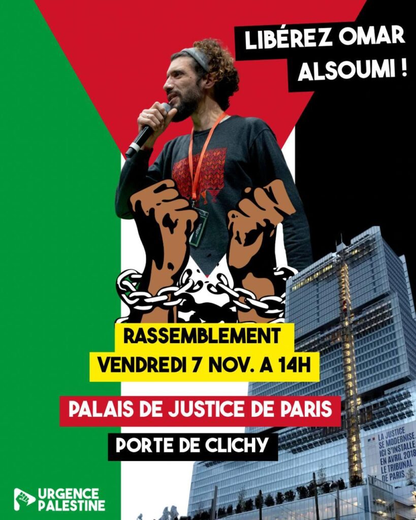 Après 48H de garde à vue dans le cadre d’une enquête pour « apologie du terrorisme » (voir notre article), le porte-parole d’Urgence Palestine et militant palestinien Omar Alsoumi sera déféré au tribunal ce vendredi 7 novembre. Afin d’exiger sa libération, ses soutiens appellent à se rassembler ce même jour dès 14H devant le Palais de Justice de Paris (porte de Clicly).