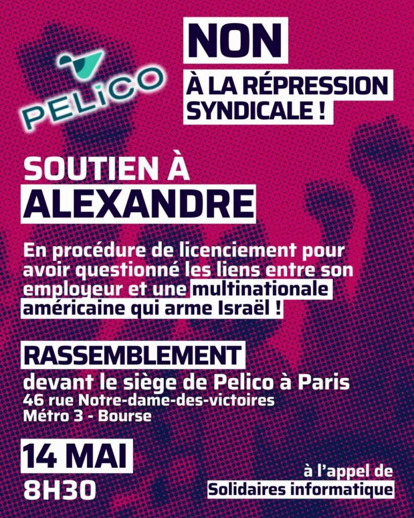Le syndicat Solidaires Informatique appelle à se mobiliser en soutien à Alexandre, syndicaliste réprimé par son employeur pour avoir dénoncé les liens de son entreprise, Pelico, avec un vendeur d’armes complice d’Israël. En particulier, ils appellent à un rassemblement ce mercredi 14 mai 8h30 devant Pelico à Paris (46 rue Notre-dame-des-Victoires, Métro 3 – Bourse).