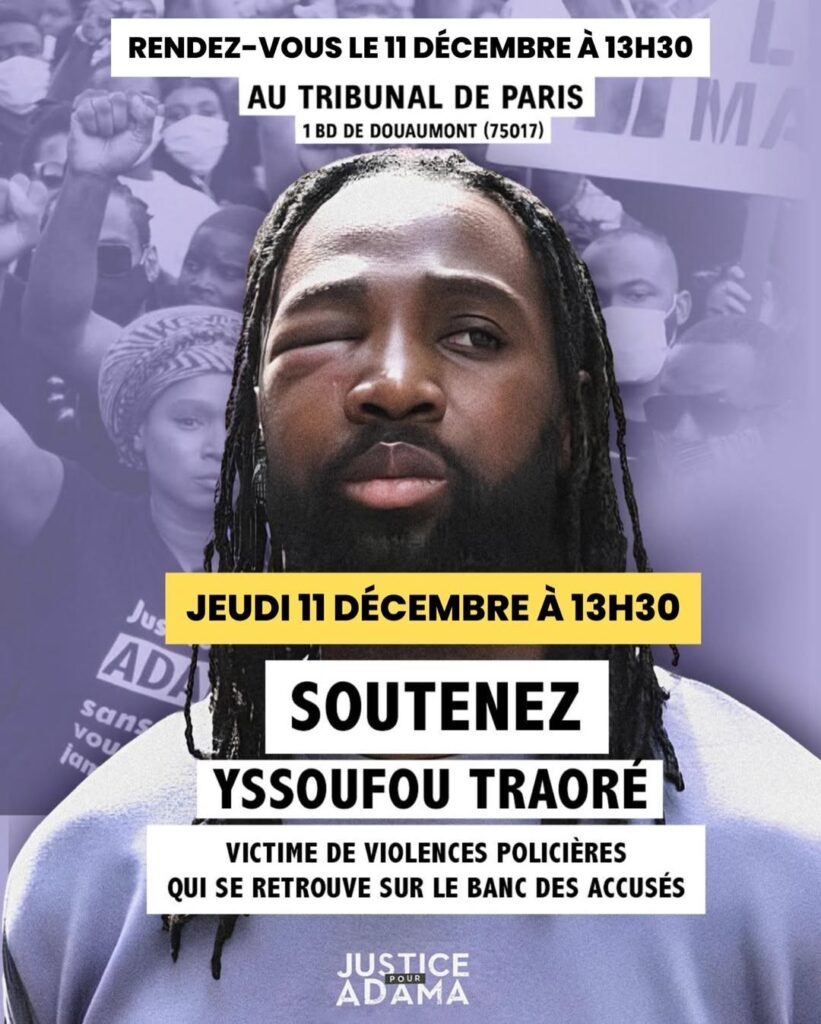 Le 11 décembre 2025, Yssoufou Traoré, frère d’Adama Traoré, comparaîtra au Tribunal de Paris pour une affaire liée aux violences policières qu’il a subies le 8 juillet 2023 lors de la dispersion d’une marche en hommage à son frère. Violenté par la BRAV-M, il a souffert d’une fracture du nez, d’un traumatisme crânien et de contusions multiples. Alors qu’il était hospitalisé, il a été placé en garde à vue et une plainte a été déposée contre lui, tandis que sa plainte pour dénoncer les violences a été classée sans suite. Plusieurs témoins ont filmé la scène, et une jeune femme a également été grièvement blessée. Les organisateurs appellent à se rassembler pour soutenir Yssoufou et dénoncer les violences policières le jeudi 11 décembre à 13H30 devant le Tribunal de Paris (1 boulevard de Douaumont, 75017 Paris).