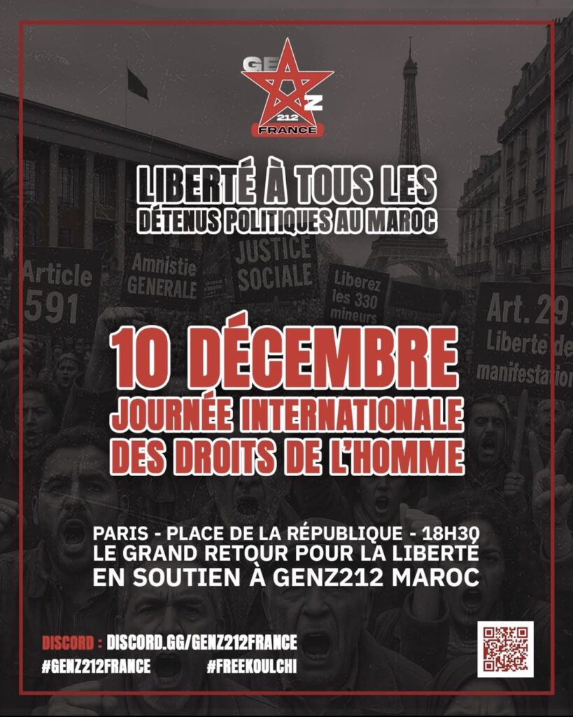 À l’occasion de la Journée internationale des droits humains, des manifestations se tiendront le 10 décembre dans plusieurs villes du Maroc, à l’appel de Genz212, du Comité de soutien aux détenus et de nombreuses organisations, pour exiger la libération des prisonniers politiques, honorer les martyrs et réaffirmer l’espoir de liberté porté par la jeunesse marocaine. Un rassemblement est également prévu à Paris, Place de la République, à 18H30, afin de faire entendre la voix du peuple marocain en solidarité avec celles et ceux que l’on a enfermés pour leur engagement militant.