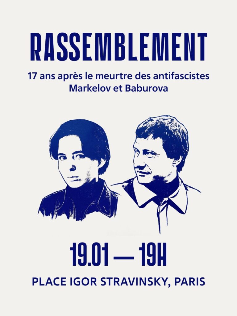 Un rassemblement antifasciste est organisé le 19 janvier à 19h, place Igor Stravinsky à Paris, en mémoire de Stanislav Markelov et Anastasia Babourova, assassinés à Moscou le 19 janvier 2009 par un militant néonazi. A cette occasion, les organisateurs dénoncent le rôle des autorités russes dans la répression du mouvement antifasciste, comme en témoigne la détention de nombreux prisonniers antifascistes (voir notre article). Dans ce contexte, l’appel souligne la nécessité d’une solidarité internationale antifasciste.