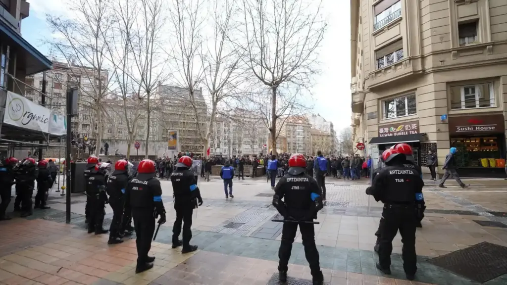 Quatre personnes ont été arrêtées aujourd’hui à Vitoria-Gasteiz suite à des affrontements ont eu lieu lors de la manifestation organisée en commémoration du 3 mars. Les personnes arrêtées sont accusés de troubles à l’ordre public et d’agression de policiers. La manifestation, organisée par l’Association des victimes du 3 mars et les syndicats ELA, LAB, ESK et Steilas, s’est déroulée hier dimanche pour marquer l’anniversaire des événements le 3 mars 1976, lorsque la police espagnole avait tué cinq travailleurs et blessé des centaines de personnes en dispersant par la force une assemblée de travailleurs dans l’église de San Francisco de Asís.