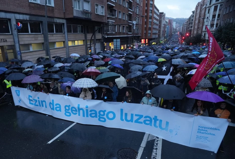 Malgré une pluie incessante, environ 65 000 personnes se sont rassemblées ce samedi 10 janvier à Bilbao, à l’appel du réseau Sare, pour exiger la fin de la législation pénitentiaire d’exception appliquée aux prisonniers basques. Soutenue par une large coalition d’organisations, la marche a revendiqué l’application du droit commun permettant la mise en liberté conditionnelle ou le régime ouvert pour les 120 prisonniers restants, dont beaucoup ont déjà purgé plus de 20 ans de prison.