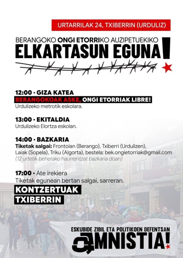 Une journée de solidarité est organisée le 24 janvier à Txiberrin (Urduliz) en soutien aux personnes de la ville de Berango poursuivies en justice pour leur engagement en faveur de l’accueil et de la solidarité aux personnes migrantes criminalisées. Cette mobilisation entend dénoncer la répression judiciaire visant des initiatives locales d’entraide et défendre le droit à l’accueil. La journée prévoit une chaîne humaine, des prises de parole, un repas populaire et des concerts, et s’inscrit dans une campagne plus large en faveur de l’amnistie et de la défense des droits civils et politiques face à la criminalisation des mouvements solidaires au Pays Basque.