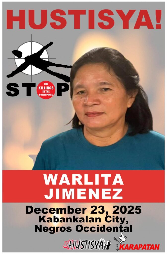 Aux Philippines le 23 décembre 2025, Warlita Jimenez, une dirigeante paysanne de 55 ans à Kabankalan City, a été tuée à son domicile par des hommes armés liés aux forces de l’État, dans un contexte de militarisation et de harcèlement contre les activistes et les familles de paysans dans cette région. Ce meurtre s’inscrit dans un schéma d’exécutions extrajudiciaires et de violences d’État visant des militants, souvent accusés de liens avec la guérilla communiste. La victime était ciblée pour sa résistance au programme gouvernemental de contre-insurrection, tandis que les défenseurs des droits humains appellent à une enquête indépendante et à la fin de la militarisation dans l’île.