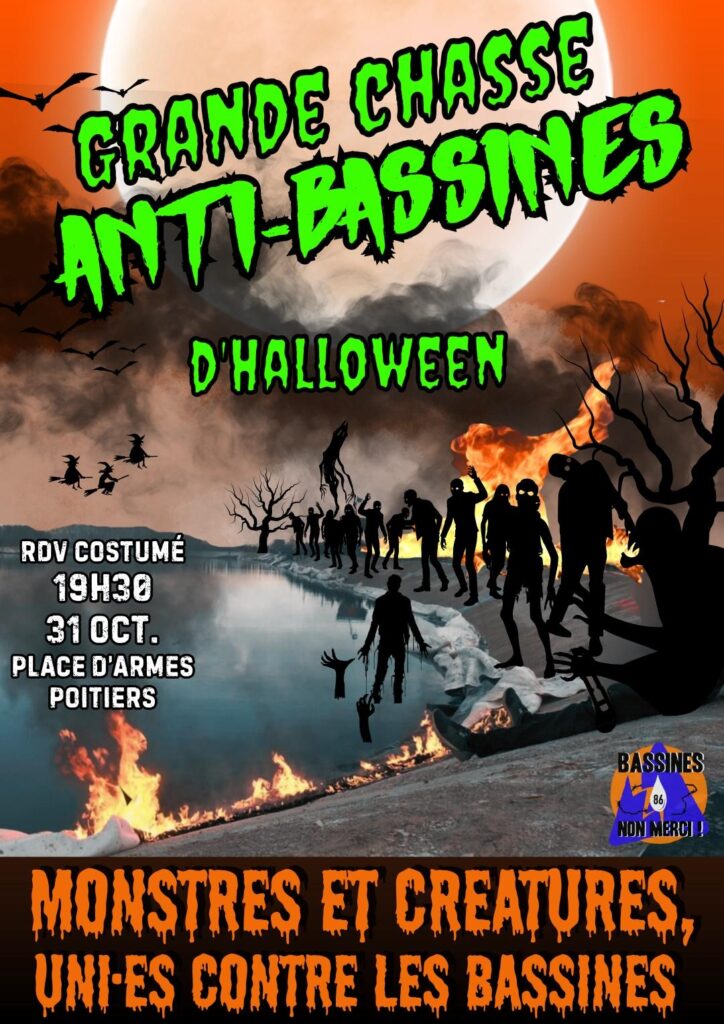 Le 31 octobre à Poitiers, deux mobilisations sont annoncées pour la soirée d’Halloween. La première par le collectif Bassines non merci (BNM), qui invite à « fêter la mort des 41 mégabassines du Clain ». La seconde appelle à « traquer les antibassines », en réponse à la première et a été lancée par plusieurs syndicats agricoles. Finalement, la préfecture autorise celle des irrigants pro-bassines et interdit la manifestation de BNM qui maintient l’initiative.