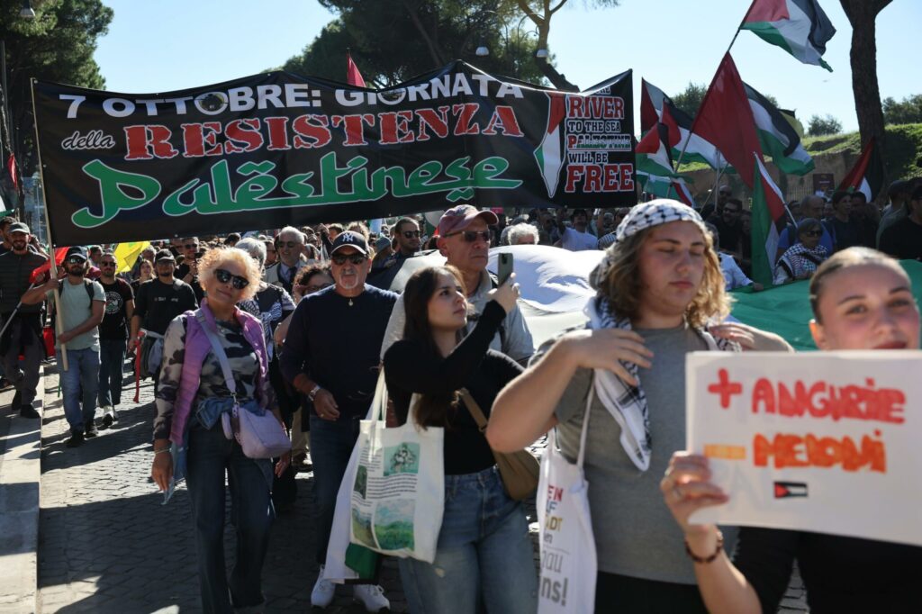 Samedi 4 octobre à Rome, près d’un million de personnes ont manifesté contre le génocide en cours à Gaza et en soutien à la Global Sumud Flotilla. Cela intervient après une semaine de mobilisation importante avec des actions incessantes dans de nombreuses villes et une grève générale politique le 3 octobre dernier avec le blocage de huit ports et de différentes usines d’armements. Dans la foule, un cortège rassemblant de nombreuses personnes et organisations (dont la section romaine du Secours Rouge International) a déployé une banderole « 7 octobre, Journée de la Résistance palestinienne », ce qui a provoqué un tollé dans les médias mainstream. En fin de journée, plusieurs centaines de personnes ont incendié des voitures et des bennes à ordures, lançant des objets et des pétards sur les forces de l’ordre, et attaquant le siège principal d’une organisation fasciste à Rome. 262 personnes ont été arrêtées et identifiées lors de ces affrontements.