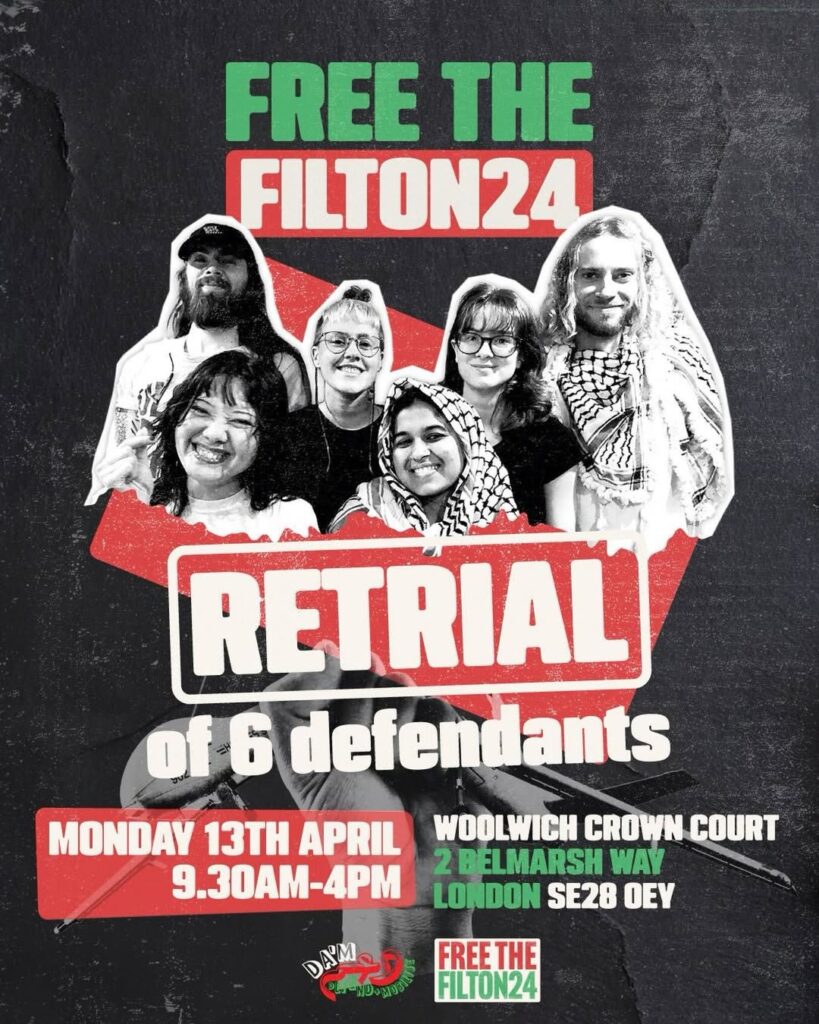 Bien qu’un jury ait refusé de les condamner sur certains chefs d’accusation, le parquet relance l’affaire, ce que leurs soutiens interprètent comme un signe de durcissement judiciaire envers les actions de solidarité avec la Palestine. Des appels à se rassembler devant le tribunal ont été lancés, présentant ce procès comme un cas test pour la répression des mobilisations militantes au Royaume-Uni.