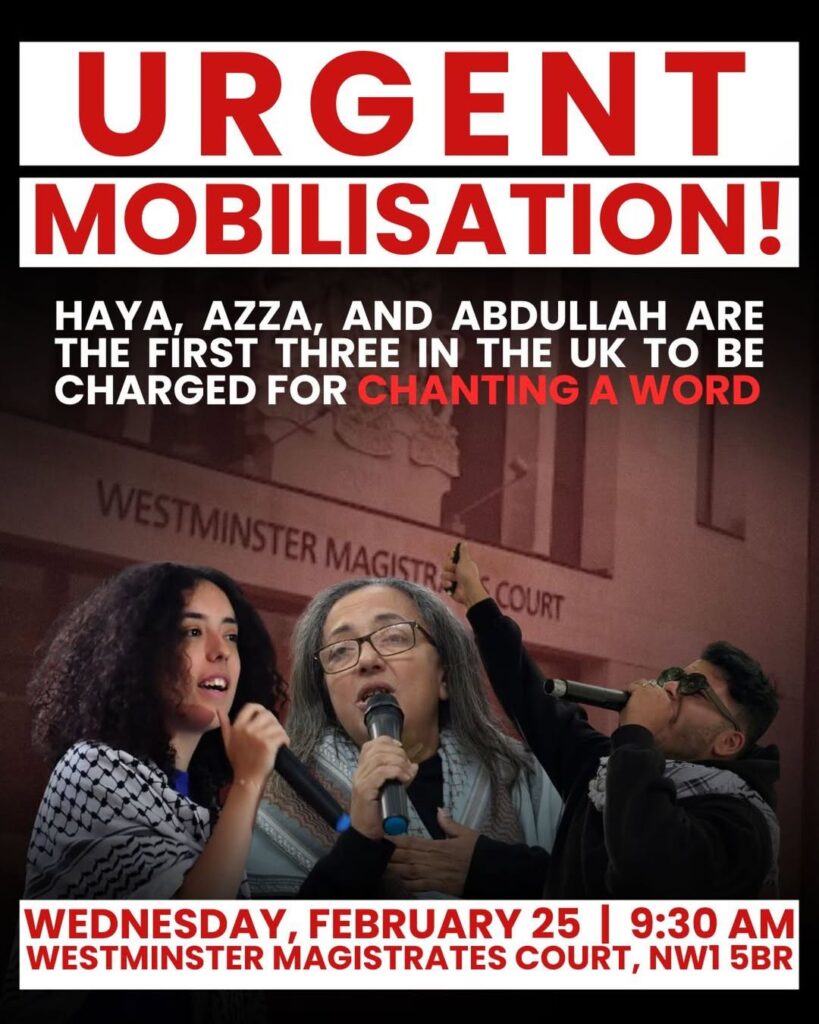 Au Royaume-Uni, trois militants (Haya, Azza et Abdullah) doivent comparaître le 25 février 2026 devant le Westminster Magistrates’ Court, devenant les premiers dans le pays à être inculpés d’une infraction pénale grave pour avoir prétendument scandé le mot « intifada » lors d’une mobilisation pro-palestinienne. Cette affaire est considérée par les autorités comme un cas test dans un contexte de durcissement sécuritaire et de restrictions accrues liées aux manifestations contre le génocide à Gaza. Face à cette situation, leurs soutiens appellent à se rassembler le 25 février dès 9H30 à Londres.
