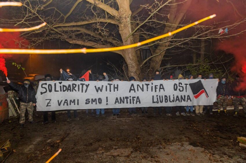 À Ljubljana, des antifascistes se sont rassemblé·es pour exprimer leur solidarité avec les militant·es d’Antifa Ost actuellement poursuivi·es en justice (voir notre article), affirmant leur soutien dans la lutte contre le néonazisme, le fascisme et toutes les formes de haine d’extrême droite. Cela intervient alors que l’antifascisme est de plus en plus largement criminalisée en Europe, tout comme aux Etats-Unis.