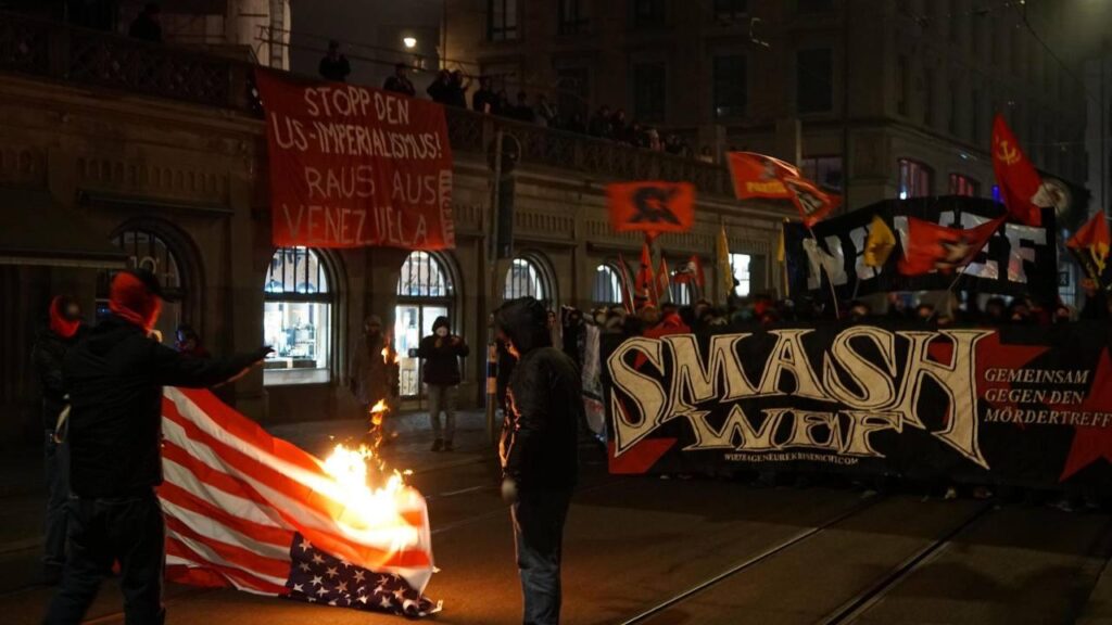 Lundi 19 janvier, plus de 3 000 personnes ont défilé à Zurich contre le Forum économique mondial (WEF), dont un cortège révolutionnaire de plus d’un millier de personnes. Le parcours a été ponctué d’actions symboliques contre des banques et entreprises partenaires du WEF, mais aussi pour dénoncer l’impérialisme états-unien au Venezuela, et s’est conclu par une occupation spontanée de la Kasernenstrasse, organisée en solidarité avec le Rojava et la lutte kurde. La police a dispersé les manifestants à coups de gaz lacrymogène, canons à eau et balles en caoutchouc. Malgré cette intervention, les participants ont défendu la zone et se sont dispersés de manière autonome après plus d’une heure de présence sur place.