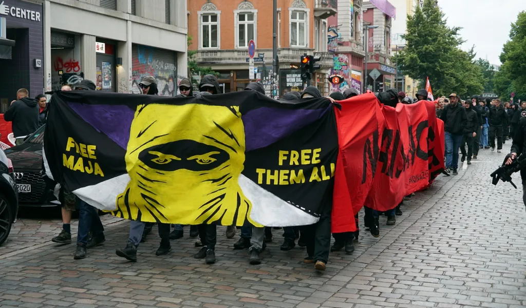 Le 5 juillet 2025, des mauvaises nouvelles sont arrivées sur l’état de santé de Maja toujours en grève de la faim, Maja pèse seulement 65 kg et a donc perdu environ 13 kg, le foie et les reins ne sont plus en très bon état. Le premier janvier, les vitres du consulat d’Allemagne à Zürich ont été brisées et sa façade taguée en solidarité avec Maja. Toujours en Suisse, un rassemblement a eu lieu devant l’ambassade d’Allemagne à Berne. Il y a eu samedi 5 et dimanche 6 des manifestations à Berlin, Dresde, Pforzheim, Chemnitz, Karlsruhe, Hambourg (plus de 600 manifestants, photo), Leipzig, Halle et ailleurs. Des tags et accrochages de banderoles ont eu lieu un peu partout et le siège du parti politique CDU à Hambourg a été caillassé la nuit du 2 au 3.
