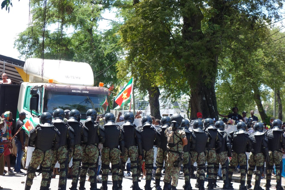 A l’appel d’organisations syndicales et civiles une foule s’est rassemblée jeudi dans la matinée dans le centre ville de Paramaribo . Le taux des changes n’en finit plus de dégringoler au Surinam, ce qui provoque un violente hausse des prix des denrées alimentaires et des combustibles et carburants. Ce jeudi était aussi celui de l’examen de la situation du pays par le FMI, qui impose comme toujours des mesures drastiques dont souffre la population. Vers midi, les manifestants ont pris pour cible l’Assemblée Nationale, en dépavant les trottoirs et jetant des pierres vers l’intérieur du Parlement. Ils ont forcé l’enceinte et commis des dégradations. La foule s’est ensuite rassemblée derrière un camion faisant office de podium pour essayer de descendre vers le Bureau du Président. Les forces de l’ordre police et armée faisaient barrage, pour les en empêcher, ce qui a galvanisé la colère des manifestants. Vers 12h30, ils ont caillassé les forces de police. Ces derniers ont répliqué en mettant la foule en joue avec leurs armes automatiques. A 13h30, la police à donné le signal de la charge avec des rafales d’armes automatiques tirées en l’air, l’utilisation des gaz lacrymogènes et une charge à la matraque. Le vent était en faveur de la police, qui a pu disperser la foule. Un coup de feu a été tiré sur un pneu avant du camion-podium, l’immobilisant. Par ces manœuvres, la police a repris la maîtrise du terrain.