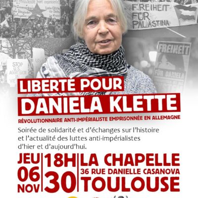Accusée d’être une ancienne membre de la RAF (Fraction Armée Rouge), Daniela Klette a été arrêtée en février 2024 à Berlin après 30 ans de clandestinité. Depuis mars 2025, elle est en procès pour une dizaine de braquages qui auraient été commis pour financer sa clandestinité. Afin d’exiger sa libération et d’échanger sur les luttes […]