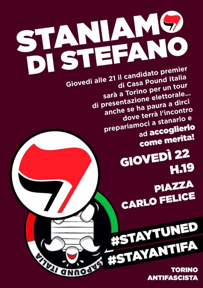 Ce matin aux alentours de 9h30, des unités de police se sont présenté sans mandat (via l’article 41 du TULPS, qui permet à la police de rechercher des armes via des perquisitions sans mandats) au domicile de jeunes activistes proches du Centre Social Askatasuna. Cette opération semble être une intimidation contre le mouvement antifasciste qui prépare une manifestation ce soir à 19h contre la venue de Simone Di Stefano, leader de Casapound.