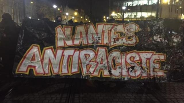 Environ 400 personnes ont répondu présent au rassemblement antifaciste vendredi soir place Viarme, à Nantes. Tenue à distance par un important déploiement de forces de l’ordre, ma manifestation n’a pas pu approcher de la salle où se tenait le meeting. Au cours des tentatives de débordement du dispositif policiers par les antifas, des projectiles ont été lancés sur les forces de l’ordre, des véhicules et des dispositifs publicitaires ont été dégradés, des murs ont été tagués et deux vitrines de banque ont été brisées. Six interpellations ont eu lieu, débouchant du quatre gardes à vue.