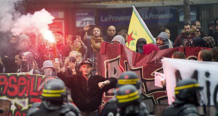 La manifestation antifasciste contre le congrès du parti fasciste européen APF a démarré Square De Meeus au lieu de Place du Luxembourg ce matin à 10h. À Porte de Namur, la police anti-émeutes et l’auto-pompe ont chargé la centaine de manif et stants antifas. Du mobilier urbain aurait été pris pour cible. 70 antifas ont été arrêtés. Plus d’info dans la journée.