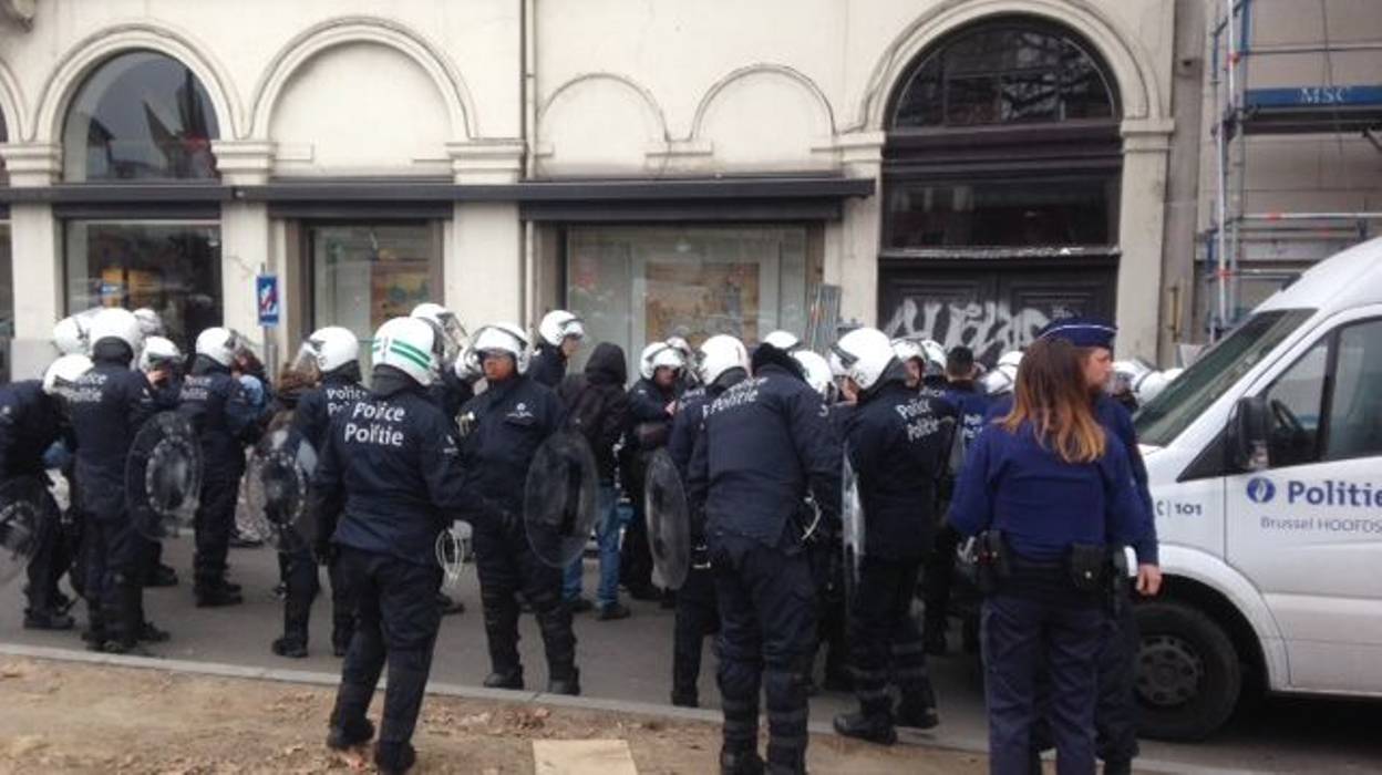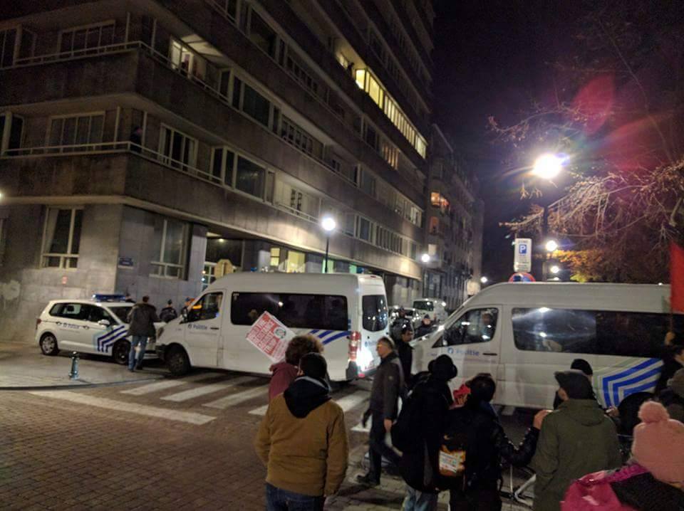 13.40: un peu plus de précision : le nombre de 70 arrestations avancé par certains médias serait exagéré, il s’agirait de 30 personnes. La manifestation (une centaine de personnes) aurait dès le départ tourné à l’affrontement avec le cordon de policiers qui protégeait le local. Les manifestants menés par un « cortège de tête » offensif se serait ensuite déplacé vers la Petite Ceinture. Un abribus JC Decaux et la vitrine d’une banque KBC ont été pris pour cibles de projectiles. La police a ensuite chargé par derrière ce qui a entraîné la dispersion des manifestants et l’arrestation d’un certain nombre d’entre eux. D’autres arrestations ne sont pas à exclure.