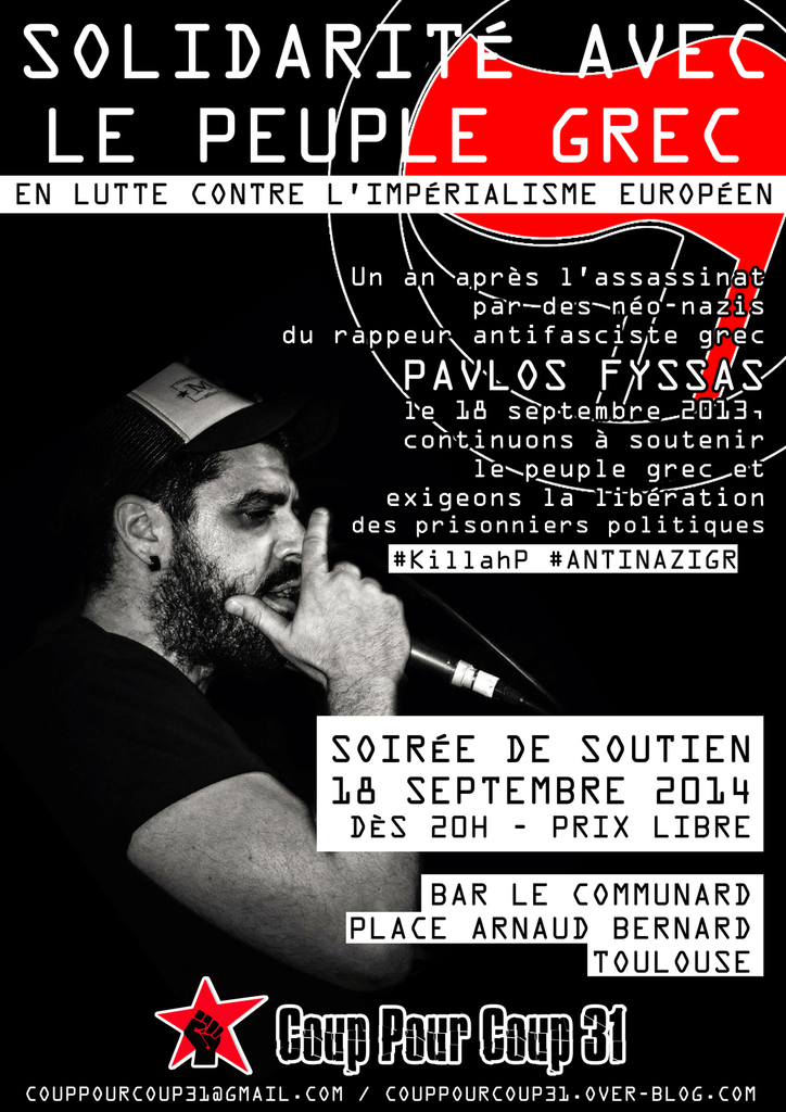 Dans le cadre de la campagne antifasciste internationale en mémoire de la mort de Pavlos Fyssas, poignardé il y a un an par un fasciste, le collectif Coup pour Coup 31 organisera une soirée en hommage à Pavlos et en soutien aux prisonniers révolutionnaires grecs au café ‘Le Communard’ (Place Arnaud Bernard), le 18 septembre à partir de 20h.