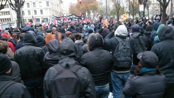 A l’occasion du congrès du Front National à Lyon une importante manifestation a eu lieu. Les arrestations ont commencées avant le début du rassemblement : plusieurs personnes ont été arrêtées après que la police ait fouillé leurs affaires, un bus de paris et un autre d’Allemagne ont été bloqué à l’entrée de la ville. La manifestation a démarré en scandant « Chasse aux immigrés, guerre aux ouvriers, c’est le programme des fascistes mais aussi du Parti Socialiste » Les vitres d’un MacDonald qui avait proposé à la ville de « débarasser la place des Rroms » ont été brisées. Un service d’ordre qui démontait les barricades a dû précipitamment quitté la manifestation et des affrontements ont rapidement éclaté entre les manifestants et la police qui attaquait l’arrière du cortège. La police s’est servie à plusieurs reprises d’auto-pompes, de gaz lacrymogènes et de flashballs, plusieurs manifestants ont été blessés et au moins 17 personnes ont été arrêtées.