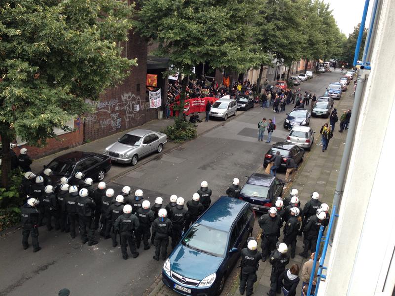 La tension est remontée d’un cran lorsque, bien escorté de policiers en civil, Philip de Winter a voulu franchir le seuil de la galerie. Des heurts ont opposés les antifascistes à cette escorte qui a sorti les matraques téléscopiques. Les robocops ont alors mené une violente charge, repoussant les antifascistes pour une partie dans le bas de la rue Marché aux herbes, pour l’autre sur la grand’place et au-delà. Il y a eu quelques blessés légers à cette occasion. Les participants au meeting du Vlaams Belang ont du renoncer au Vaudeville, et se sont rassemblés, sous bonne protection policière, à la « chaloupe d’or », sur la Grand Place.